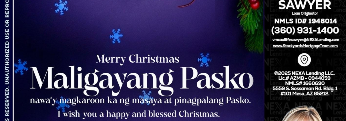 Maligayang Pasko - Virginia McAuliffe Sawyer -Mortgage Loan OriginatorHi, my name is Virginia McAuliffe Sawyer. I’m a Loan Officer with NEXA Lending LLC., offering personalized mortgage solutions, fast customized quotes, great rates and service with integrity.