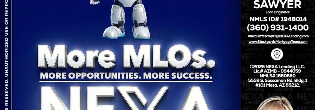 MORE MLOs - Virginia McAuliffe Sawyer -Mortgage Loan OriginatorHi, my name is Virginia McAuliffe Sawyer. I’m a Loan Officer with NEXA Lending LLC., offering personalized mortgage solutions, fast customized quotes, great rates and service with integrity.