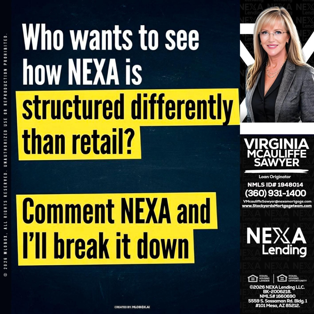 who want to see - Virginia McAuliffe Sawyer -Mortgage Loan OriginatorHi, my name is Virginia McAuliffe Sawyer. I’m a Loan Officer with NEXA Lending LLC., offering personalized mortgage solutions, fast customized quotes, great rates and service with integrity.