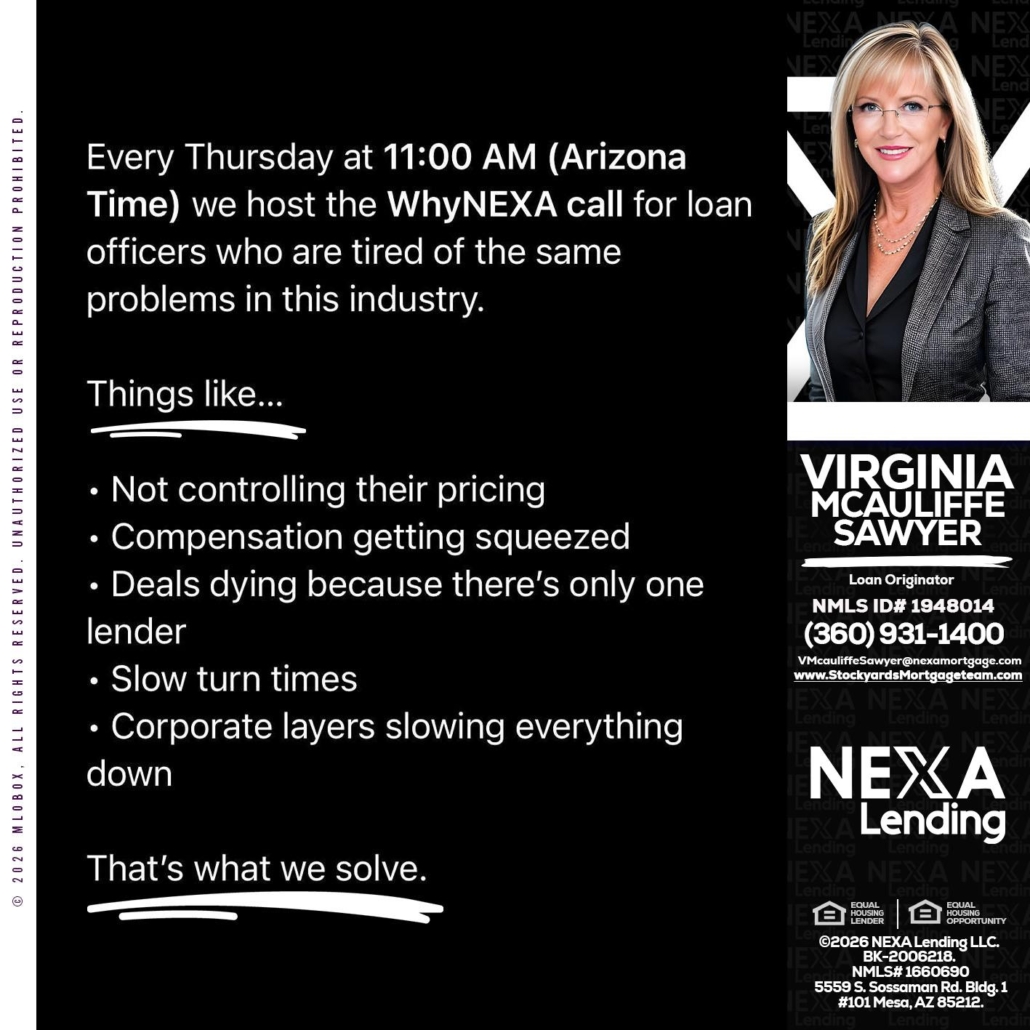 WHY NEXA - Virginia McAuliffe Sawyer -Mortgage Loan OriginatorHi, my name is Virginia McAuliffe Sawyer. I’m a Loan Officer with NEXA Lending LLC., offering personalized mortgage solutions, fast customized quotes, great rates and service with integrity.